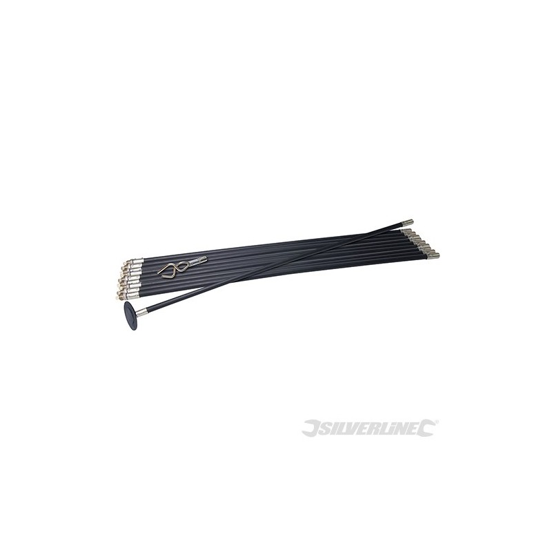 Sada na čištění kanalizace a odpadů. Obsahuje 10 ks 920 mm pružných, polypropylenových tyčí; 1 ks pryžovou čistící hlavu 100 mm a 1 ks dvojitý šnekový šroub 50 mm.